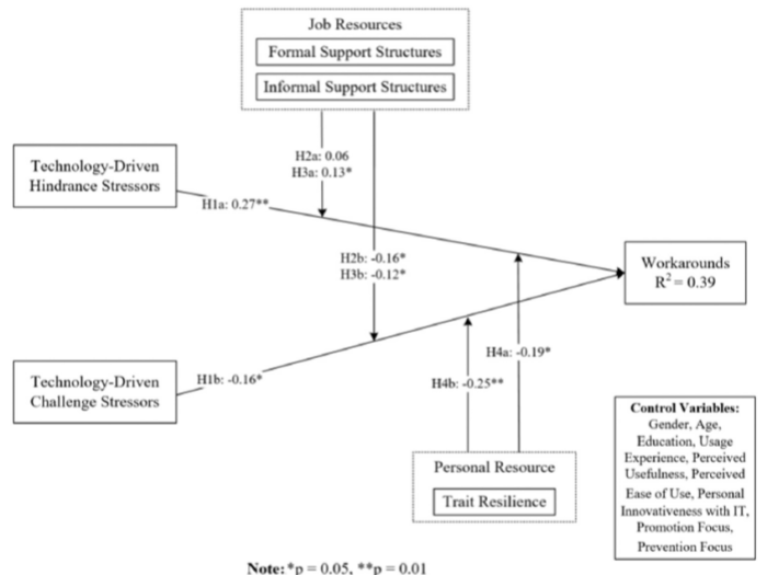 该研究指出,在当前信息技术迅速发展的背景下,技术驱动的心理压力源成为各行业员工处理工作时面临的主要心理压力源之一(如公立医院医护人员需熟练掌握各医疗信息系统而对工作产生焦虑等负面情绪)。然而,不同的技术驱动心理压力源会引发员工的变通式信息系统使用行为。该研究在工作需求-资源(JD-R)模型的基础上,将挑战型和阻碍型的技术驱动心理压力源作为影响员工变通式信息系统使用行为的不同工作需求纳入其中。
