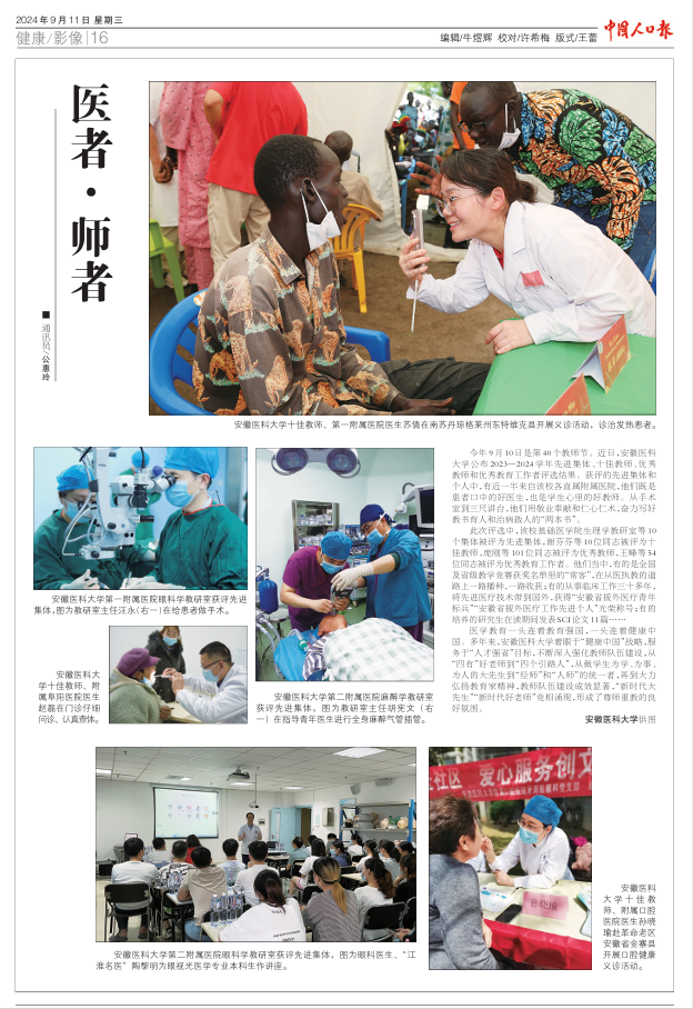 此次评选中,该校基础医学院生理学教研室等10个集体被评为先进集体,谢芬芬等10位同志被评为十佳教师,庞刚等101位同志被评为优秀教师,王峰等54位同志被评为优秀教育工作者。他们当中,有的是全国及省级教学竞赛获奖名单里的“常客”,在从医执教的道路上一路播种,一路收获;有的从事临床工作三十多年,将先进医疗技术带到国外,获得“安徽省援外医疗青年标兵”“安徽省援外医疗工作先进个人”光荣称号;有的培养的研究生在读期间发表SCI论文11篇……